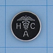 Round XR Caduceus Emblem ~ Style Number 4647 Only Size Available for this Style Number, many other titles shown below. 11/16" diameter - shown on a 1" blue square Manufactured by Hook-Fast Specialties, Inc.