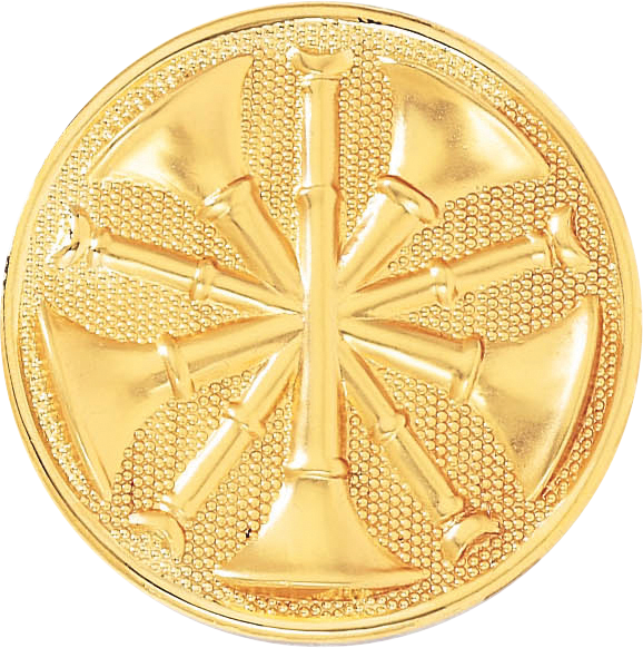 | This intricate cap badge for a Fire Chief is very similar to our A2811, featuring five crossed horns yet with a thinner and polished rim plus a textured background. |