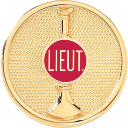 | This classic cap badge for a Lieutenant features a vertical horn with matte background and a thick rope rim along the outer edge! |